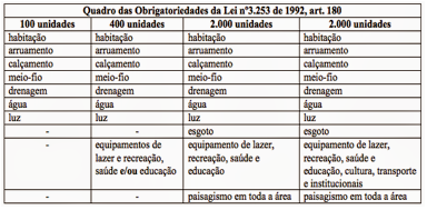 Resumindo num quadro as exigências relativas às infraestruturas e equipamentos urbanos trazidas pela Lei 3.253, de 29 de Dezembro de 1992, no Art. 180 que fica assim: