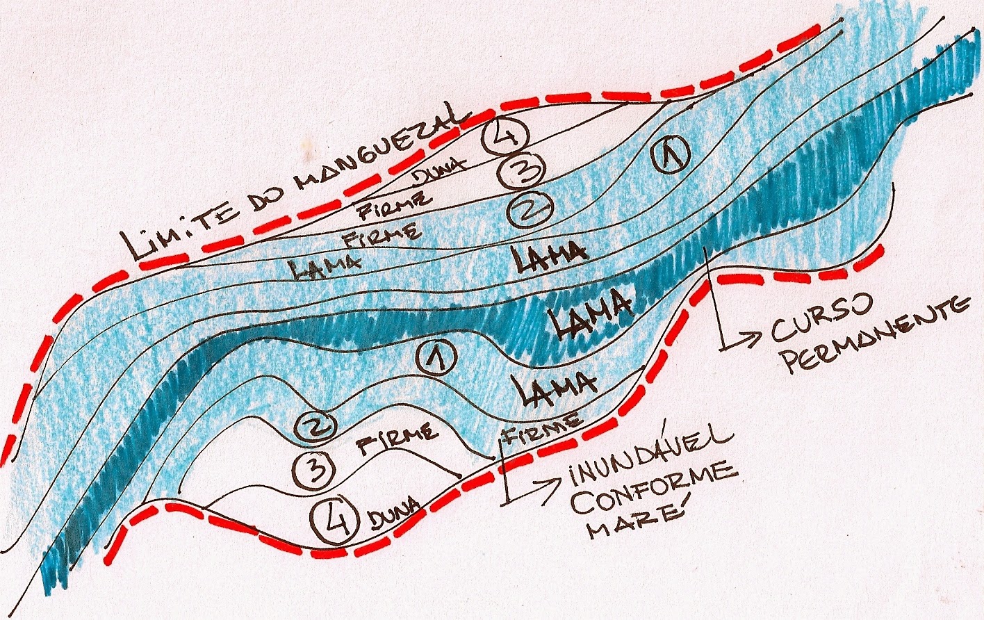 Limites do manguezal que não se restringem a floresta de mangue ou a lama, mas ao conjunto ecossistêmico destes. Com as faixas de mangue vermelho, preto e branco indo do terreno inundado ao seco e arenoso, respectivamente. Replantar a Rhizophora mangle (mangue vermelho) nos terrenos lamosos inundáveis, a Avicennia germinans ou Avicennia shaueriana (mangue preto) na faixa entre a terra firme e a água e a Laguncuria racemosa (mangue branco) no bordo da terra firme, onde os animais mais comuns do ecossistema manguezal podem voltar a frequentar, como os caranguejos (conforme ensinaram nossos biólogos). Também podem ainda ser replantadas as complementares do manguezal como: o bredo-do-mangue (Sesuvium portulacastrum), o cipó- de- mangue (Rhabidadenia biflora), junquinho (Eleocharis geniculalata), samambaia-açú (Acrostichim aureum).